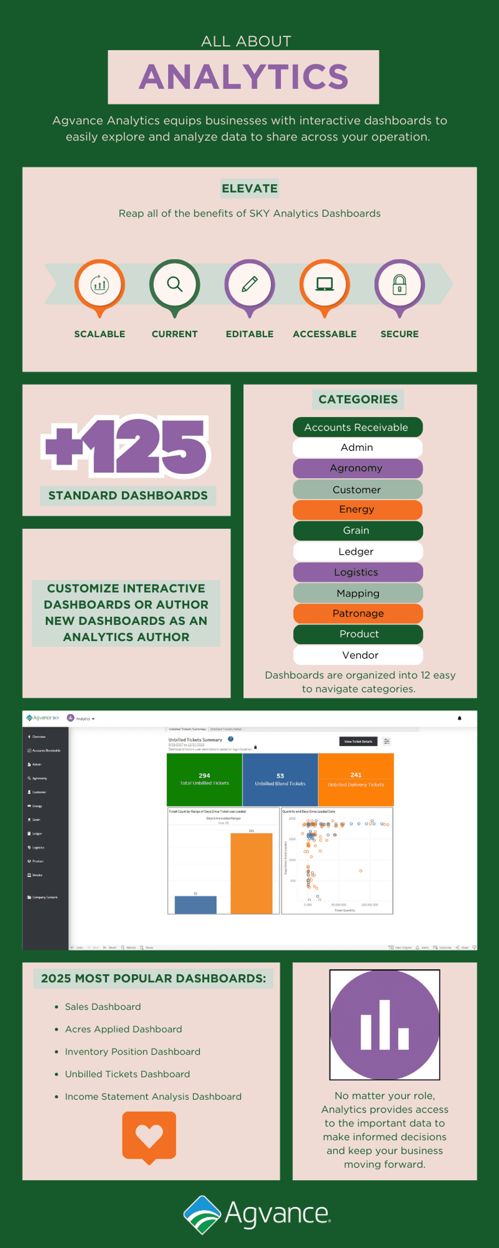 SKY Analytics is a component of Agvance SKY that equips you with over 125 interactive dashboards, allowing you to explore and analyze your business data. But first, what is a dashboard? Dashboards compile various pieces of your data, presenting them in charts and graphs to make the information easier to comprehend and access. They are organized by project, keeping you organized and ensuring the information you need is close at hand!